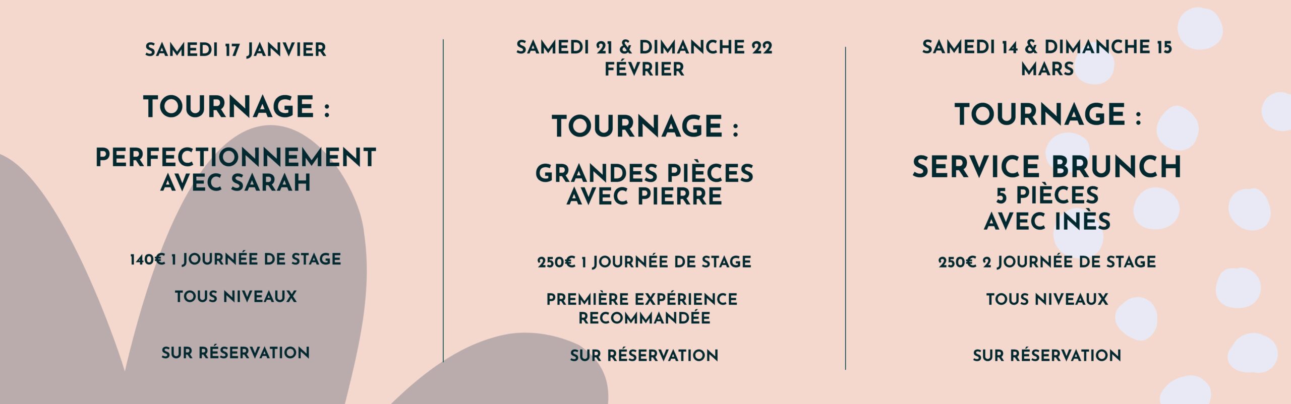 Tournage, modelage, décoration… les cours sont mixtes, vous pouvez venir avec un projet ou une envie et nous vous proposerons un suivi à la carte.